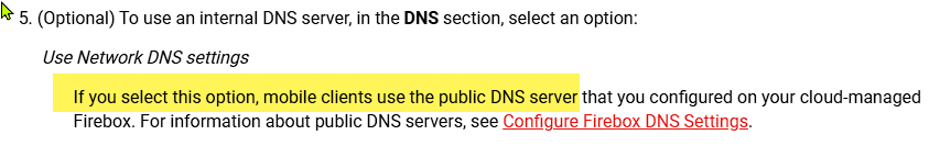 This option allows mobile clients to use the public DNS server configured on your cloud-managed Firebox.