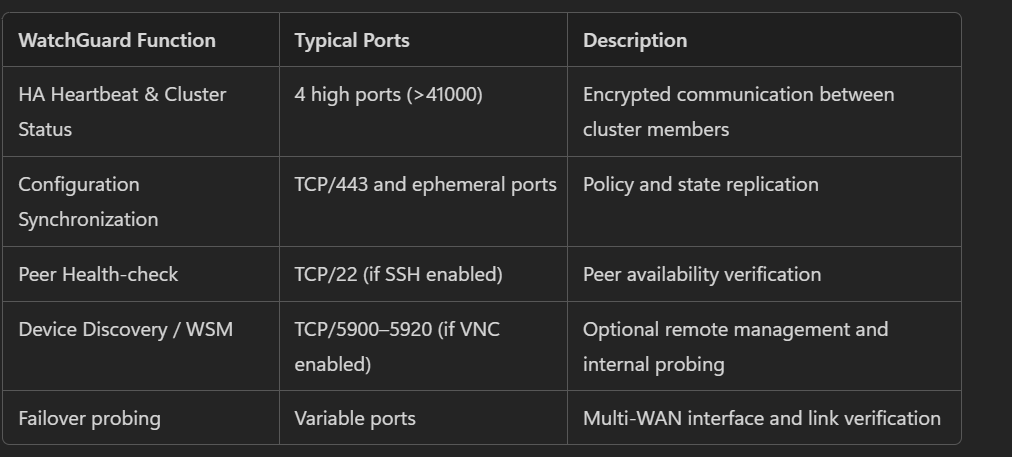 I am currently investigating some network behavior related to my WatchGuard Firebox devices configured in a FireCluster (High Availability). The SOC team informed me that this behavior is benign, and they shared the following table with common ports used for different cluster functions: