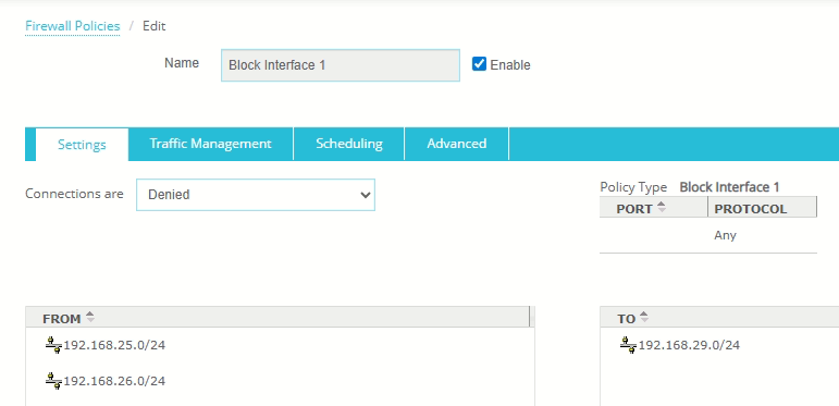 1) reviewing your policies which may allow these undesired connections from 1 firewall interface to another - and replacing Any-trusted or Any with a different From/To interface name or alias.